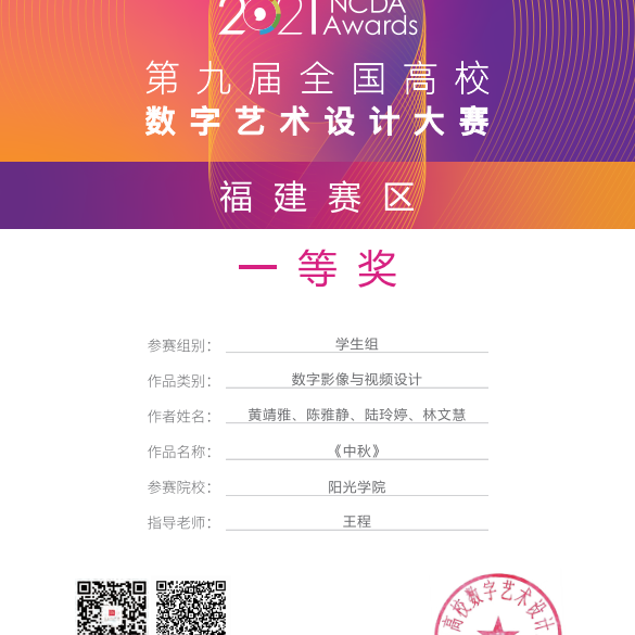 2021-2022学年第一学期荣获第九届全国高校数字艺术设计大赛福建赛区一等奖;