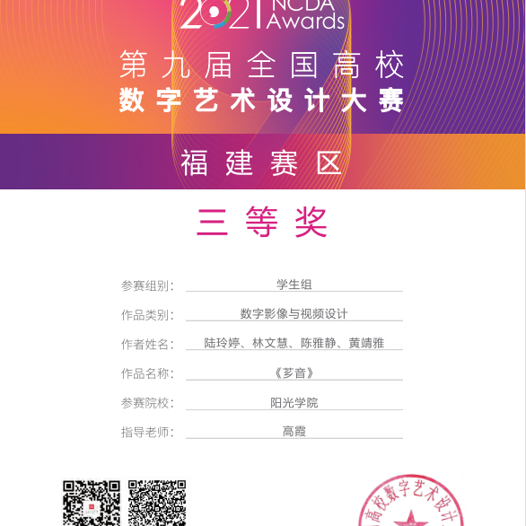 2021-2022学年第一学期荣获第九届全国高校数字艺术设计大赛福建赛区三等奖。