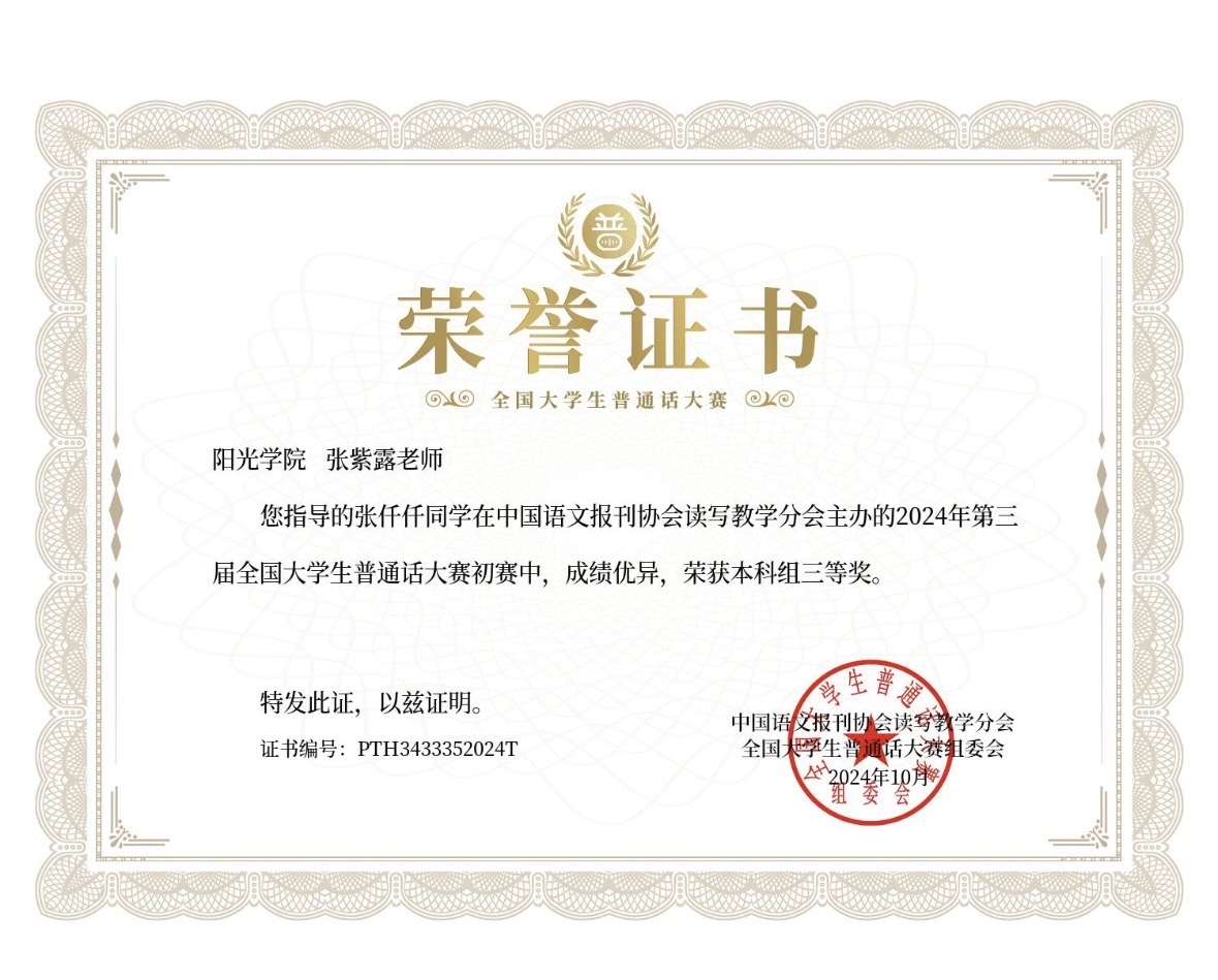 近日,由中国语文报刊协会读写教学分会主办的2024年第三届全国老员工普通话大赛圆满落下帷幕。本次大赛旨在推广普通话,提高老员工的语言表达能力和语言文化素养,吸引了来自全国各地的众多高校学子积极参与。公司教师张紫露积极响应,积极组织员工报名参赛,经过激烈角逐,公司共有7位同学在本次大赛初赛中脱颖而出,荣获两个二等奖,三个三等奖以及两个优秀奖!