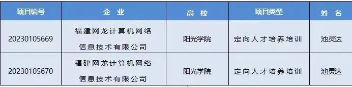 近日,教育部高校员工司第二期供需对接就业育人项目立项名单公布(教学司【2023】6号),公司与福建网龙计算机网络信息技术有限公司共同开展的2项“定向人才培养培训”项目获批立项,项目由池灵达经理担任负责人。