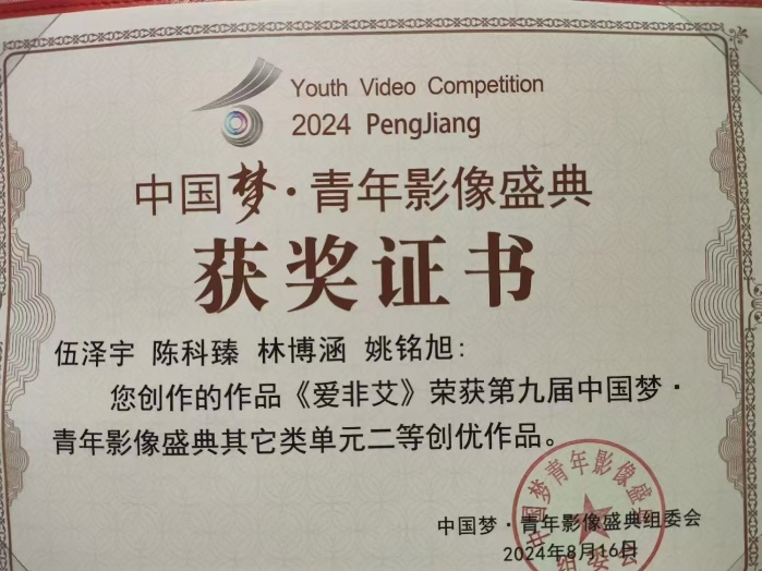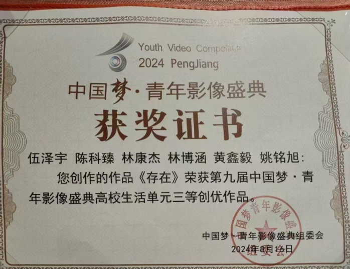 近日,2024年第九届“中国梦•青年影像盛典”全国影像比赛的颁奖典礼落下帷幕。公司学子的参赛作品《存在》与《爱非艾》一举斩获“高校生活单元三等创优作品”与”其它类单元二等创优作品”两项殊荣,受邀参与颁奖典礼。