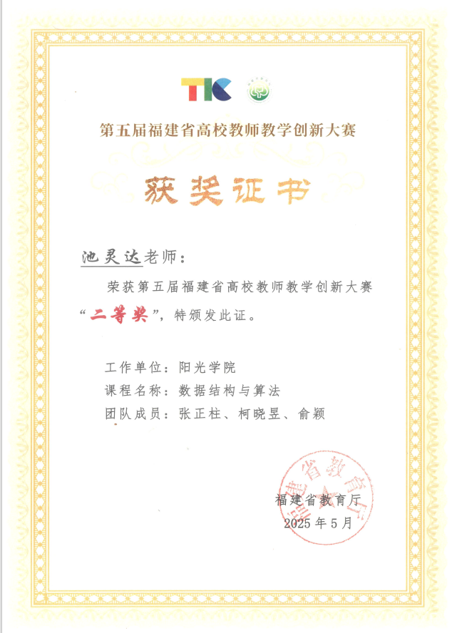 2025年,开展AI化课程教学改革,首创“GPS-REN教学模式”获福建省教学创新大赛二等奖。