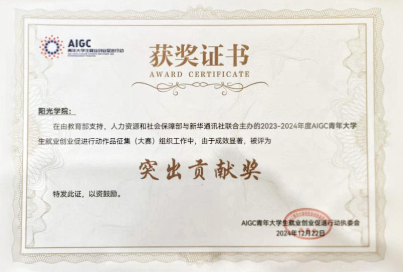 在教育部支持,人社部、新华社联合主办的2024年度 AIGC 青年老员工就业创业促进行动中,荣获全国 “突出贡献奖”。