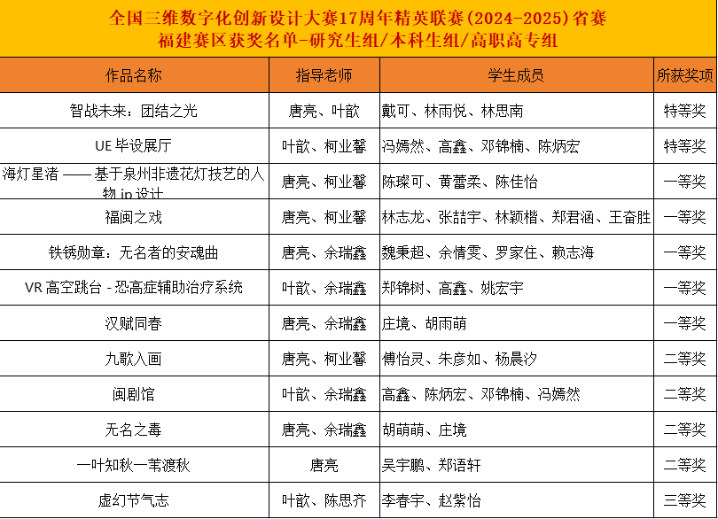 虚拟现实应用方向走在应用创新的前沿,在校期间师生共同参与政府、高校、知名企业项目制作,项目涵盖虚拟展厅、数字孪生、数字文旅、元宇宙大空间、沉浸式游戏,虚拟现实教育场景等,师生作品参展2024年数字中国建设峰会、2025年福建省旅交会。